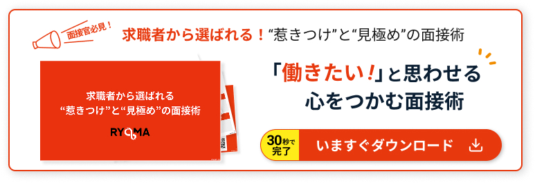 採用に悩む人事担当者に向けて、120社以上の採用実績を持つRYOMAが面接ノウハウを無料公開!以下からダウンロードいただけますので、ご活用ください。